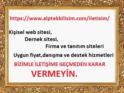 ARAYIN GÖRÜŞELİM Üye firmalarımızdan ''alptekbilisim/iletişim '' internet dünyasında web tasarım,yazılım alanında güvenilir hizmet sunmanın yanısıra teknolojik destek hizmetlerinde de bulunmaktadır.Dünyanın neresinde olursanız olun,bir cep telefonu,bilgisayar ve tablet kadar yakınınızda her türlü tanıtım,web sitesi,dernek,cemiyet,ürün satışı,kişisel tanıtım siteleri gibi ihtiyaçlarınızda güvenle başvurabileceğiniz üye firmamıza başarılar dileriz.![]() |