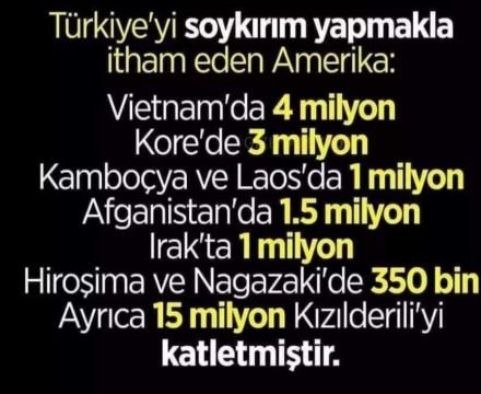 ASIL ''DEĞİŞMEYEN TEK ŞEY DEĞİŞİMİN KENDİSİDİR.''DÜNYANIN DÖRT BİR KÖŞESİNDE YAPILAN KATLİAMLARIN ,ENERJİ SAVAŞLARI İÇİN İNSAN HAYATININ HİÇE SAYILDIĞI ORTADOĞU VE AFRİKA DA YAPILANLARIN TAMAMININ SORUMLUSU AMERİKA SON ZAMANLARDA ÇIKARLARINA TERS DÜŞÜYOR,İNSANLIĞI SAVUNUYOR,YOKSULA,AÇ İNSANLARA YARDIMDA LİDER KONUMA GELİYOR DİYE ÜLKEMİZİ OLMAYAN BİR SOYKIRIM ...!! HİKAYESİ İLE SUÇLAMAYA ÇABALAMAKTADIR. ASIL AMACI DEĞİŞEN DÜNYA VE TEKNOLOJİ İLE İNSANLARIN HER TÜRLÜ BİLGİYE KOLAYCA ULAŞABİLDİĞİ ÇAĞIMIZDA LİDERLİK KONUMUNUN VE ESKİ GÜCÜNÜN KAYBOLMAYA BAŞLAMASI İLE PANİKLEMEYE BAŞLAMASIDIR. ORTADOĞU VE İSLAM COĞRAFYASINDA HIZLA YILDIZI PARLAYAN VE LİDER ÜLKE KONUMUNA GELEN TÜRKİYE KAPİTALİZM VE SÖMÜRGECİLİĞİN ÖNÜNDEKİ EN BÜYÜK ENGELİ TEŞKİL ETMEKTE , BAŞTA AMERİKA,İNGİLTERE,FRANSA OLMAK ÜZERE SÖMÜRGECİ ZİHNİYETLERİ RAHATSIZ ETMEKTEDİR. GEÇMİŞTEN GÜNÜMÜZE ''TÜRK ÜN TÜRK TEN BAŞKA DOSTU YOKTUR'' SÖZÜ SON ZAMANLARDA DAHA DA ANLAM KAZANMIŞTIR. ÖZELLİKLE ÜLKEMİZE KARŞIN TOPYEKÜN SÜRDÜRÜLEN KARALAMA VE EKONOMİK BASKILARA SİYASİ GÖRÜŞÜMÜZ NE OLURSA OLSUN MİLLET OLARAK TEK VÜCUT KARŞI ÇIKMALI VE ÜLKEMİZİN YANINDA YER ALMALIYIZ. GEÇMİŞTE YAŞADIKLARIMIZI (EKONOMİK VE SİYASİ BASKILARI,SAĞ/SOL,MEZHEP ÇATIŞMALARINI VS.. ) UNUTMADAN ÜLKEMİZİN GELECEĞİ İÇİN İŞİMİZE,GÜCÜMÜZE BAKMALIYIZ. BUGÜN ORTADOĞU BAŞTA OLMAK ÜZERE AFRİKA VE İSLAM COĞRAFYASINDA YILLARDIR SÜRDÜRÜLEN YIKIMLAR,SOY KIRIMLAR UNUTULMAMALIDIR. FRANSA SOYKIRIM DERKEN AFRİKA DA KATLETTİĞİ BİNLERCE İNSANI, İNGİLTERE SÖMÜRGE İÇİN ÖLDÜRDÜĞÜ,ESİR ETTİĞİ MİLYONLARI,HİNDİSTANI,SURİYE Yİ AMERİKA KIZILDERELİLERİ,SİYAHİ İNSANLARI,AFGANİSTAN,JAPONYA,AFRİKAYI,KAMBOÇYA YI,VİETNAMI,IRAK I İSRAİL TÜM BUNLARIN FİKİR BABALIĞI VE MİSYONERLİĞİ İLE İSLAM COĞRAFYASINDA GERÇEKLEŞTİRDİĞİ YIKIMLARI HATIRLAMALI,HATIRLATILMALIDIR. UNUTMAYALIM Kİ BAŞKA TÜRKİYE YOK.BU SAVAŞ HAÇ VE HİLALİN SAVAŞIDIR. |