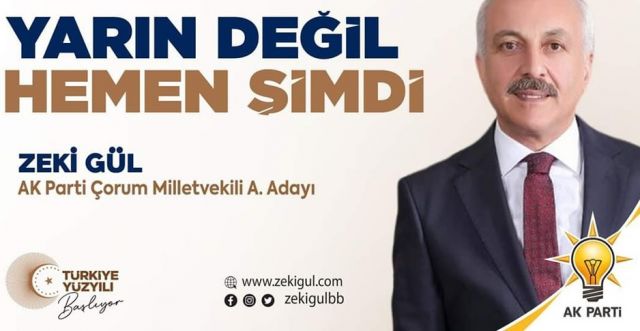 GEÇEN DÖNEM ÇORUM BELEDİYE BAŞKANLIĞI GÖREVİNDE BULUNAN SAYIN ZEKİ GÜL 2023 GENEL SEÇİMLERİNDE AK PARTİ MİLLETVEKİLİ ADAY ADAYLIĞINI AÇIKLAMIŞTIR.