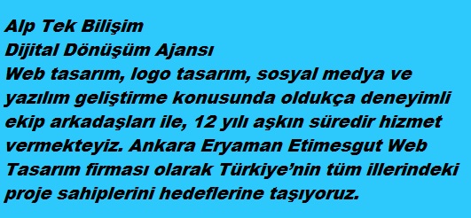 DİJİTAL DÜNYA![]() Alp Tek Bilişim olarak, müşteri memnuniyetini her zaman en ön planda tutuyoruz. Proje süreçlerinde müşterilerimizle sıkı bir iletişim kuruyor, onların geri bildirimlerini dikkate alıyor ve ihtiyaçlarına en uygun çözümleri sunmaya özen gösteriyoruz. Müşterilerimizin başarıları bizim için en büyük referans ve onların memnuniyeti, bizim için en değerli motivasyon kaynağıdır. Teknolojik altyapımızı sürekli olarak güncel tutarak, müşterilerimize en son trendleri ve en iyi uygulamaları sunmaya odaklanıyoruz. İnternet dünyasındaki hızlı değişimlere ayak uydurabilmek ve müşterilerimizi dijital arenada rekabet avantajına sahip kılmak için teknolojiyi etkin bir şekilde kullanıyoruz. Tüm bu süreçlerde, işimizi etik değerler ve şeffaflıkla yürütüyor, müşterilerimizle sağlam ve güvene dayalı bir ilişki kuruyoruz. Alp Tek Bilişim olarak, dijital dünyadaki varlığınızı güçlendirmek ve başarıya ulaşmanızı sağlamak için her zaman yanınızdayız. Profesyonel ekibimizle birlikte, işinize değer katmak ve sizi dijital platformlarda öne çıkarmak için heyecanla çalışıyoruz. Müşterilerimizin hedeflerine ulaşmalarında en iyi çözüm ortağı olmaya devam edeceğiz ve dijital dünyada sizinle birlikte büyümek için sabırsızlanıyoruz. Ankara web tasarım avantajlarımız Alp Tek Bilişim olarak, müşterilerimize sunduğumuz avantajlar ve çözümlerle onların dijital dünyada öne çıkmasına katkıda bulunmaktan gurur duyuyoruz. Her zaman müşteri odaklı ve sonuç odaklı bir yaklaşımla hareket ederek, onların başarılarına ortak olmak ve dijital dünyada bir adım önde olmalarını sağlamak için çalışmalarımıza devam edeceğiz. Bizimle çalışmanızın avantajları… Ankara kurumsal site tasarımcı Alp Tek Bilişim olarak, işimizi uzman bir ekip ile yürütmenin önemine inanıyoruz. Alanında deneyimli, yetenekli ve yaratıcı ekibimiz, müşterilerimizin dijital hedeflerine ulaşmalarını sağlamak için sürekli olarak çaba gösterir. Her projede özveriyle çalışan ekibimiz, müşteri odaklı yaklaşımı sayesinde her zaman ihtiyaçlara yönelik özelleştirilmiş çözümler sunar ve müşteri memnuniyetini en üst düzeyde tutar. Dijital ajans Alp Tek Bilişim olarak, müşterilerimize kapsamlı bir ürün ve hizmet yelpazesi sunuyoruz. Kurumsal web tasarım, sosyal medya danışmanlığı ve Google Ads reklamları gibi dijital pazarlama alanında uzmanlaşmışken, aynı zamanda QR menü, katalog, kartvizit ve logo tasarımlarımız ile markaların dijital dünyada görsel kimliğini güçlendiriyoruz. Bu çeşitlilik, müşterilerimizin ihtiyaçlarına en uygun çözümleri kolayca bulmalarını sağlar. Sonuç Odaklı Yaklaşım: Alp Tek Bilişim olarak, müşterilerimizin başarılarına odaklanıyoruz ve sonuç odaklı bir yaklaşımla çalışıyoruz. Projelerin her aşamasında müşteri ile sıkı bir iş birliği içinde olur, ihtiyaçlarını anlamaya ve hedeflerine uygun çözümler üretmeye özen gösteririz. Dijital dünyada gerçekleştirdiğimiz projelerin başarısı ve müşterilerimizin memnuniyeti, bizim için en büyük motivasyon kaynağıdır. İşimizi titizlikle ve özenle yaparak müşterilerimizin beklentilerini aşmaya çalışır, her projede daha iyiyi hedefleriz. Vizyonumuz: Dijital dünyada öncü bir teknoloji şirketi olarak, müşterilerimizin ihtiyaçlarına en uygun, yenilikçi ve kaliteli çözümler sunarak onların başarılarına katkıda bulunmak ve sektörümüzde lider konumda olmaktır. Misyonumuz: Müşterilerimizin dijital dönüşüm süreçlerinde güvenilir bir yol arkadaşı olmak, kapsamlı danışmanlık ve özelleştirilmiş çözümler sunarak onların hedeflerine ulaşmalarını sağlamaktır. Müşteri memnuniyetini her zaman en üst düzeyde tutmak için teknolojideki gelişmeleri yakından takip ediyor ve sürekli kendimizi yeniliyoruz. Hedeflerimiz: Müşterilerimizin ihtiyaçlarına yönelik özelleştirilmiş çözümler sunarak onların dijital varlıklarını en etkili şekilde yönetmelerine yardımcı olmak. Müşterilerimizin web sitelerini, dijital pazarlama stratejilerini ve marka kimliklerini güçlendirerek online platformlarda öne çıkmalarını sağlamak. Teknolojik altyapıyı sürekli olarak güncelleyerek müşterilerimize en son trendleri ve yenilikleri sunmak. Kaliteli hizmetlerimiz ve müşteri odaklı yaklaşımımızla uzun vadeli iş ilişkileri kurmak ve müşterilerimizin sadık bir iş ortağı olmak. ALPTEK BİLİŞİM Olarak 30'dan fazla sektör için 200'den fazla web sitesi hazırladık, Google Ads reklamları ve sosyal medya hesapları için danışmanlık verdik. QR Menü, katalog, kartvizit ve logo tasarımlarımız ile Markanızı dijital dünyaya taşıyoruz. İLETİŞİM 0312 429 ALP Kaşmir Center AVM |