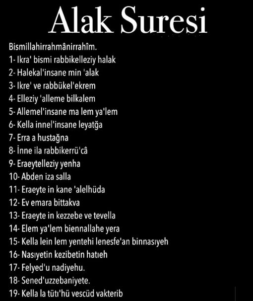 Alak suresi Anlamı Rahmân ve Rahîm olan Allah'ın ismiyle. 1- Yaratan Rabbinin adıyla oku! 2- İnsanı bir kan pıhtısından yarattı! 3- Oku! Rabbin sonsuz kerem sahibidir. 4- O Rab ki kalemle yazmayı öğretti. 5- İnsana bilmediği şeyleri öğretti. 6- Hayır! Doğrusu (kâfir) insan azgınlık eder. 7- Kendisinin muhtaç olmadığını zannettiği için. 8- Muhakkak ki dönüş mutlaka Rabbinedir. 9-10 - Namaz kıldığı zaman, bir kulu engelleyeni gördün mü? 11- Gördün mü (ne dersin?), ya o (kul) doğru yolda olur, 12- Veya kötülüklerden sakınmayı emrederse? 13- Gördün mü, ya bu (adam, hakkı) yalanlar, yüzçevirirse, 14- O adam, Allah'ın kendini gördüğünü hiç bilmiyor mu? 15-16 - Hayır, hayır! Eğer o, bu davranışından vazgeçmezse, and olsun ki biz, onu perçeminden, o günahkâr ve yalancı perçeminden tutup cehenneme sürükleriz. 17- O zaman o taraftarlarını yardıma çağırsın. 18- Biz de Zebanileri çağıracağız. 19- Hayır, sakın onu dinleme de, secde et ve yaklaş!.