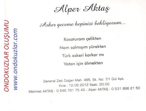 ALPER AKTAŞAKDERE DE OTURAN RAHMETLİ KUYUCU ZEYNEP VE MEHMET GÜNEY İN KIZI RUKİYE GÜNEY AKTAŞ VE MEHMET AKTAŞ IN OĞLU ALPER AKTAŞ IN ASKER KINASI VARDIR.TÜM ÜYE VE SİTE ZİYARETÇİLERİMİZ DAVETLİDİR.