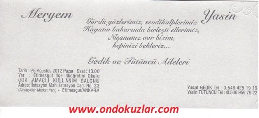 CELAL GEDİK İN OĞLU YUSUF GEDİK İN KIZI MERYEM İN 26 AĞUSTOS PAZAR GÜNÜ YAPILACAK OLAN NİŞAN TÖRENİNE TÜM HEMŞEHRİLERİMİZ DAVETLİDİR.