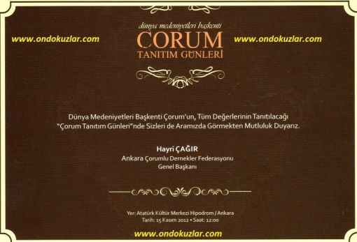 15-18 KASIM TARİHLERİNDE DÜZENLENEN ''DÜNYA MEDENİYETLER BAŞKENTİ ÇORUM''TANITIM ETKİNLİĞİNE TÜM HEMŞEHRİLERİMİZ,SİTE ZİYARETÇİLERİMİZ,ÜYELERİMİZ VE VATANDAŞLARIMIZ DAVETLİDİR.ANKARA DA YAŞAYAN VE MEMLEKET ÖZLEMİ ÇEKEN TÜM HEMŞEHRİLERİMİZİN KENDİLERİNDEN BİR ŞEYLER BULACAĞI,ÖZLEM GİDERECEĞİ,TANIŞMA VE KAYNAŞMANIN EN ÜST SEVİYEDE YAŞANACAĞI BU ETKİNLİĞİ KATILIM AYNI ZAMANDA DA ANKARA DA YAŞAYAN BİZLERİN NASIL BİR ARAYA GELEBİLDİĞİNİ GÖSTERMESİ VE VERİLECEK MESAJ ANLAMINDA ÇOK BÜYÜK ÖNEM TAŞIMAKTADIR.LÜTFEN KATILIMA ÖNEM VERELİM. |