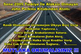 BÖYLE OLUYOR Sene 2005 Türkiye ile bir alâkası olmayan John Perkins kitabında anlatıyor; "Kendi otomobilini üretemeyen ülkeye borç verip otobanlar yaptırırız. Sonra onlara arabalarımızı satarız. Sonra bankalarını satın alırız. O bankalardan halka ucuz krediler verip daha çok araba almalarını sağlarız. Böylece verdiğimiz o krediyi arabamızı satarak geri alırız, hem de faiziyle. O ülkeye dünya bankası ya da kardeş kurumlardan kredi ayarlarız. Ayarlanan kredi "ASLA" o ülkenin hazinesine gitmez. O ülkede ‘proje‘ yapan bizim şirketlerimizin kasasına girer. Enerji santralleri, sanayi alanları, limanlar, dev havayolları yapılır. Aslında insanların işine yaramayan bir yığın beton. Bizim şirketlerimiz kazanır o ülkedeki birileri de nemalandırılır. Toplum bu düzenekten hiçbirşey kazanmaz. Ama ülke büyük bir borcun altına sokulmuş olur. Bu o kadar büyük bir borçtur ki ödenmesi imkansızdır. Plan böyle işler. Sonunda ekonomik danışmanlar/tetikçiler olarak gider onlara deriz ki; "Bize büyük borcunuz var ödeyemiyorsunuz. O zaman petrolünüzü satın, doğal gazınızı bize verin, askeri üslerimize yer gösterin, askerlerinizi birliklerimize destek olmaları için savaştığımız bölgelere gönderin, Birleşmiş Millletler de bizim için oy verin! Elektrik su kanalizasyon sistemlerinizi özelleştirin! Onları Amerikan şirketlerine ya da diğer çok uluslu şirketlere satın..." Sosyal hizmetleri, teknik sistemleri, eğitim kurumlarını, sağlık kurumlarını hatta adli sistemleri ele geçiririz. Bu, ikili, üçlü, dörtlü bir darbeler serisidir."