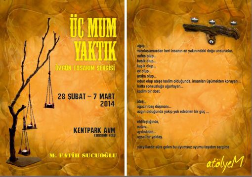 SERGİ Sevgili dostlar, ÜÇ MUM YAKTIK adlı üçüncü sergim 28 ŞUBAT 2014 Cuma günü ANKARA KENTPARK AVM'de açılıyor. 07 MART 2014 tarihine kadar devam edecek olan bu sergimde ağaçlar ve boncuklarla yaptığım tasarımlar yer aldılar. HERKESİ ÖZLEMLE BEKLİYORUM. SEVGİLER... M.FATİH SUCUOĞLU KÜLTÜR VE TURİZM BAKANLIĞI DEVLET HALK DANSLARI TOPLULUĞU SANATÇISI NOT: 28 ŞUBAT 2014 SAAT:19:00'DA SERGİNİN MUMLARINI BİRLİKTE YAKALIM.