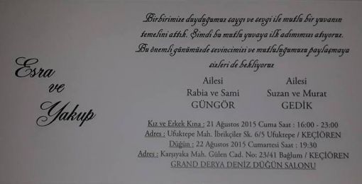 DAVET SAMİ GÜNGÖR ÜN GEÇİRMİŞ OLDUĞU RAHATSIZLIK SEBEBİ İLE ERTELENEN DÜĞÜN MERASİMİKINA :19 EYLÜL 2015 CUMARTESİ SAAT 16:00 DA AYNI ADRESTE DÜĞÜN: 20 EYLÜL 2015 PAZAR GÜNÜ SAAT 16:00 DA AYNI DÜĞÜN SALONUNDA YAPILACAKTIR.TÜM HEMŞEHRİLERİMİZ DAVETLİDİR. ![]() |