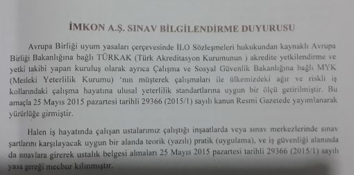 İNŞAAT ÇALIŞANLARI VE FİRMALAR İÇİN ÇOK ÖNEMLİ DUYURU İNŞAAT SEKTÖRÜNDE FAALİYET GÖSTEREN FİRMA VE İNŞAAT KALEMLERİNDE ÇALIŞAN USTALAR, İŞÇİLERİ KAPSAYAN YASA GEREĞİ MAYIS 2016 TARİHİ İTİBARİ İLE ''MESLEKİ YETERLİLİK BELGESİ VE KİMLİK KARTI''ZORUNLULUK HALİNE GELMİŞTİR.BU TARİHTEN İTİBAREN DAHA EVVEL ÇEVRE VE ŞEHİRCİLİK BAKANLIĞI NDAN ALINAN GEÇİCİ BELGELER HÜKÜMSÜZDÜR.MAYIS 2016 TARİHİ İTİBARİ İLE BELGESİZ USTA/İŞÇİ ÇALIŞTIRAN FİRMALAR VE ÇALIŞANLARA CEZAİ İŞLEM UYGULAMASI BAŞLAYACAKTIR. BELGELENDİRME İŞLEMİ ÜLKEMİZDE MYK VE TÜRKAK TARAFINDAN YETKİLENDİRİLMİŞ KURULUŞLAR TARAFINDAN YAPILMAKTADIR.İMKON A.Ş. YETKİLENDİRİLMİŞ KURULUŞ OLARAK SINAV YAPMAKTA VE BELGELENDİRME İŞLEMLERİNİ TAMAMLAYAN PROFESYONEL EKİBİ İLE HİZMET VERMEKTEDİR. YAPILACAK SINAVLARIN YASA İLE BELİRTİLEN SINAV ÜCRETLERİ BULUNMAKTA OLUP;SINAVDA BAŞARILI OLANLARA ÜCRETLER İADE EDİLMEKTEDİR.SINAVDA BAŞARISIZ OLMA DURUMUNDA 2. SINAV HAKLARI BULUNMAKTADIR. KİMLİK VE YETERLİLİK BELGESİ ALMA BAŞVURU 0506 321 1919 ![]() ![]() ![]() ![]() ![]() ![]() |