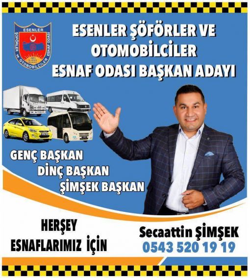 ESENLER ŞOFÖRLER VE OTOMOBİLCİLER ESNAF ODASI BAŞKAN A.ADAYI HEMŞEHRİMİZ SECAATTİN ŞİMŞEK E İSTANBUL DA YAŞAYAN TÜM ÇORUMLU HEMŞEHRİLERİMİZİN DESTEKLERİNİ BEKLİYORUZ.BİRLİKTE BEREKET VE GÜÇ VARDIR.