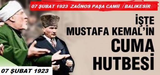 CUMA HUTBESI;Metnin Bugünkü Türkçesi “Ey millet! Allah birdir, şanı büyüktür. Allah’ın selâmeti, sevgi ve iyiliği üzerinize olsun. Peygamber Efendimiz Hazretleri, Cenâb-i Hak tarafından insanlara dinî hakikatleri tebliğe memur edilmiş ve resul olmuştur. Temel nizami, hepimizin bildiği Kur’ân-ı Azimussan’daki açık ve kesin hükümlerdir. İnsanlara maneví mutluluk vermiş olan dinimiz, son dindir, mükemmel dindir. Çünkü dinimiz; akla, mantığa ve gerçeklere tamamen uymakta ve uygun gelmektedir. Eğer akla, mantığa ve gerçeklere uymamış olsa idi bununla diğer ilâhî tabiat kanunları arasında birbirine zıtlık olması gerekirdi. Çünkü bütün tabiat kanunlarını yapan Cenab-ı Hak’tır. Arkadaşlar! Cenab-ı Peygamber çalışmalarında iki yere, iki eve sahipti. Biri kendi evi, diğeri Allah’in evi idi. Millet işlerini Allah’ın evinde yapardı. Hazret-i peygamber’in mübarek yollarını takip ederek bu dakikada milletimize ve milletimizin şimdiki ve geleceğine ait konuları görüşmek maksadıyla bu kutsal yerde, Allah’ın huzurunda bulunuyoruz. Beni bu şerefe kavuşturan Balıkesir’in dindar ve kahraman insanlarıdır. Bundan dolayı çok memnunum. Bu vesile ile büyük bir sevaba nail olacağımı ümit ediyorum. Efendiler! Camiler birbirimizin yüzüne bakmaksızın yatıp kalkmak için yapılmamıştır. Camiler, söylenenleri dinleme ve ibadet ile beraber din ve dünya için neler yapılması lazım geldiğini düşünmek, yani birbirimizin görüş ve düşüncelerini almak için yapılmıştır. Millet işlerinde her ferdin zihninin başlı başına faaliyette bulunması lâzımdır. İşte biz de burada din ve dünya için, geleceğimiz için her şeyden önce hakimiyetimiz için neler düşündüğümüzü meydana koyalım. Ben yalnız kendi düşüncemi söylemek istemiyorum. Hepinizin düşüncelerini anlamak istiyorum. Millî emeller, millî irade yalnız bir şahsın düşünmesinden değil, millet fertlerinin tamamının arzularının, emellerinin bileşkesinden ibarettir. Bundan dolayı benden ne öğrenmek, ne sormak istiyorsanız serbestçe sormanızı rica ederim.” 07 Şubat 1923 BALIKESIR – Zagnos Paşa Camii (ALINTI REFİK AY)