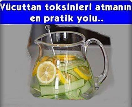 Hayatımız boyunca pek çok sebeple vücüdumuzda biriken toksinler, bizde başta hastalıklar olmak üzere, pek çok sağlık sorununa sebep olan bir durum. Vücutta biriken bu zehirlerin dışarı atılması çok daha sağlıklı ve kaliteli bir hayat sürmemiz için son derece önemlidir. Toksin Attırıcı içeceklerin başında su gelmekte hepimizin bildiği gibi.. Suyu bir de bizim önerdiğimiz şekilde içmeyi deneyin deriz.. Vücuttan toksinlerin atmanın en pratik yolu.. Hem toksinlerden kurtulacaksınız, hem de bazı ek faydalarını da göreceksiniz. Şimdi bir sürahi alın ve içine mümkünse, PH değeri 8 üzerin olan su doldurun.. Vereceğimiz tariflerden herhangibirini uygulayabilirsiniz.. Limonlu Su : Birkaç dilim limon atın. Limon vücudun temizlenmesi ve alkali olmasına katkıda bulunacaktır. Nanenli Su : Birkaç dal nane ekleyin. Hem suyun tadı güzel hale gelecek, hem kokusu! Midenize ve sindiriminize de destek verecektir. Salatalıklı Su : Dört-beş dilim salatalık ekleyin. Salatalık vücudunuzun nemlenmesi için harikadır ve inflamasyona karşı etkilidir. Zencefilli su : Bir bilemediniz iki ince dilim ekleyin. Midenize iyi gelecek ve sindiriminize de. Özellikle gastritiniz varsa. Bu suları bir gece buzdolabında bekleterek kullanırsanız, daha da etkili olacaktır. En azından birkaç saat..