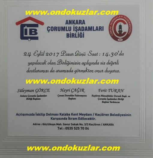 ANKARA ÇORUMLU İŞADAMLARI BİRLİĞİ TARAFINDAN 24.09.2017 PAZAR GÜNÜ SAAT 14:30 DA KEÇİÖREN BELEDİYESİ ÖNÜNDE DÜZENLENEN BİRLİK AÇILIŞINA ANKARA DA YAŞAYAN TÜM HEMŞEHRİLERİMİZ DAVETLİDİR. ORGANİZASYONDA EMEĞİ GEÇEN HERKESİ SAYIN BAŞKAN SÜLEYMAN GÖKÇE NİN ŞAHSINDA KUTLAR; ANKARA ÇORUMLU İŞ ADAMLARI BİRLİĞİ NE BAŞARILAR DİLERİZ.